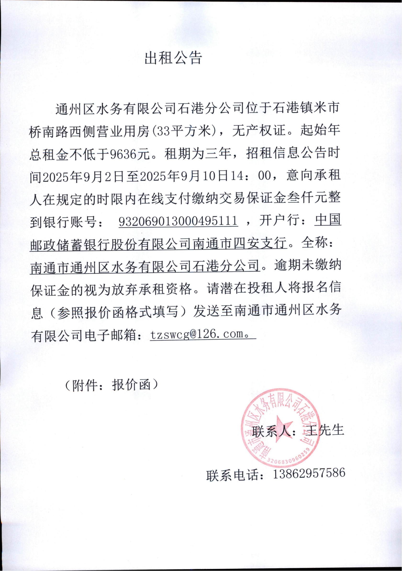 - 南通市通州區水務有限公司石港分公司米市橋南路西側營業(yè)用房(33平方米)出租公告2025-09-01